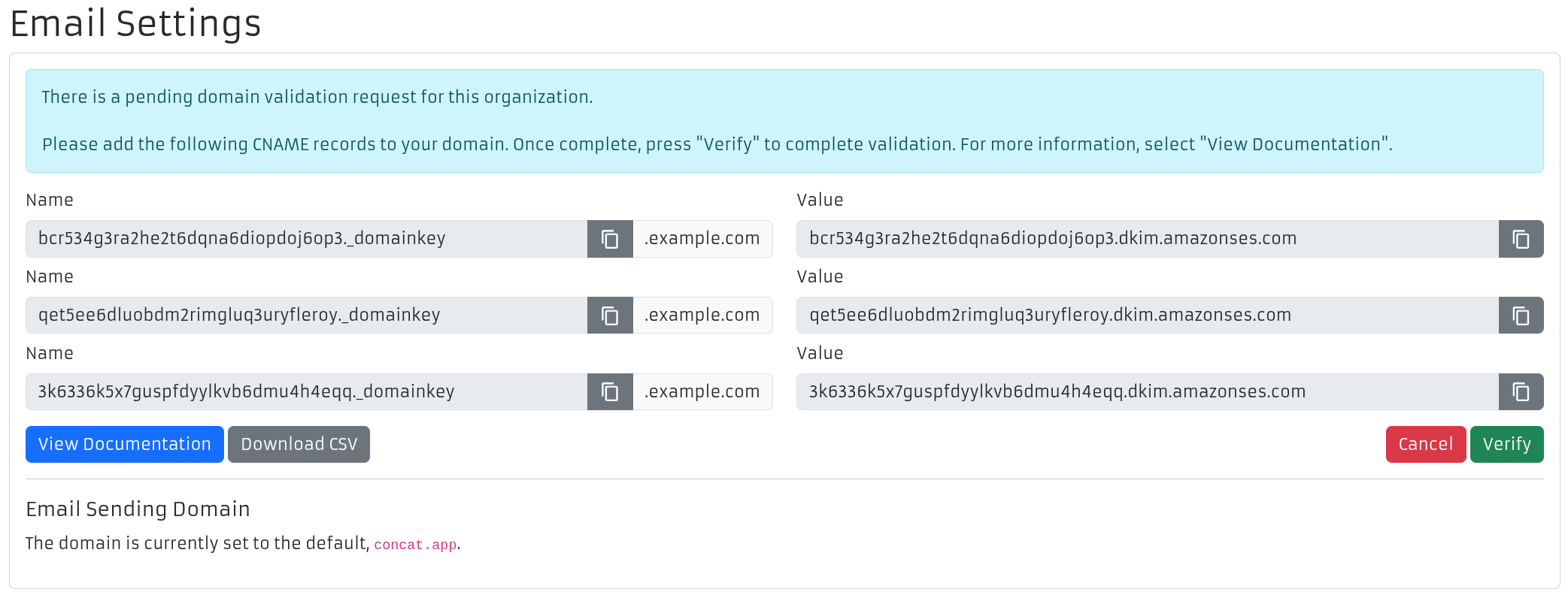 Once you have set the records, wait up to 5 minutes for your DNS provider to update the records. Then, press "Verify" in ConCat.